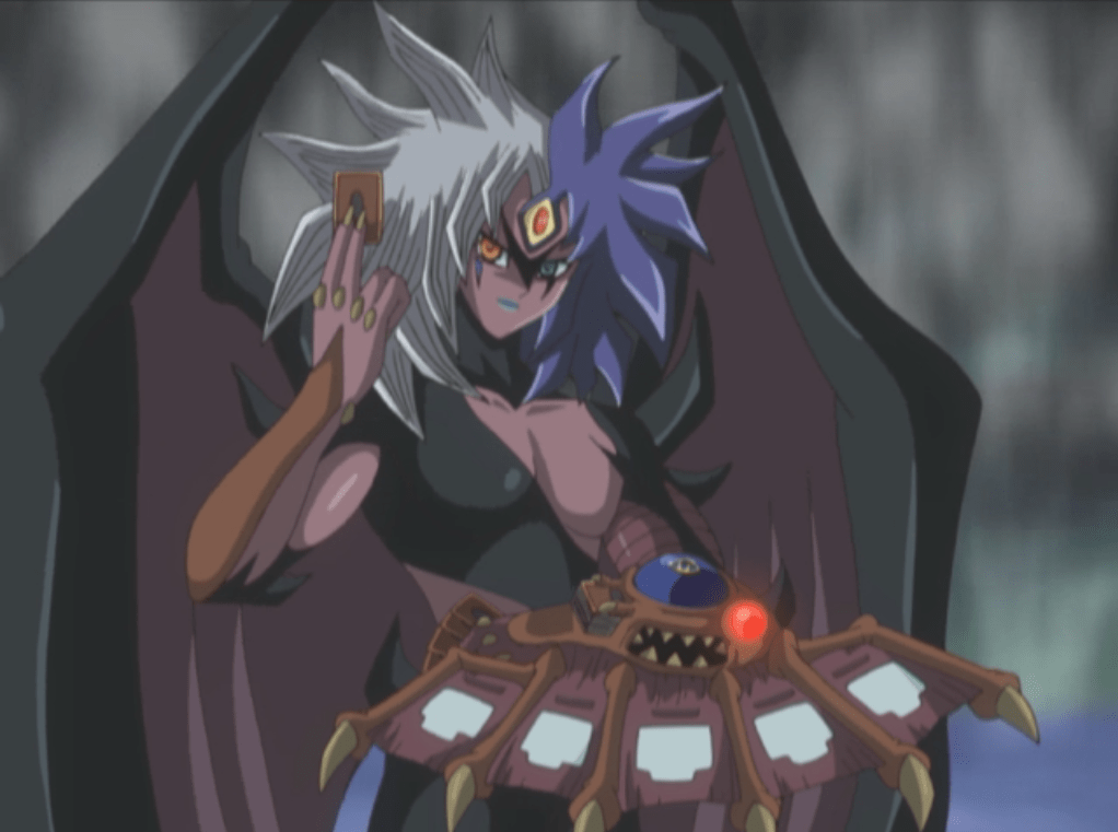 Yubel’s character design makes their gender expression (in the Japanese version) androgynous, not solely feminine, in homage to the antagonistic bigender Baron Ashura from the manga Mazinger Z by Go Nagai. Yubel’s gynandromorphism manifests as a breast and full eyelashes on their right side with a flat pec and plain eyeliner on the left. At times, they speak in a deeper voice played by Hisao Egawa. These bodily traits make their duplexity more literal than other GX gender nonconforming characters, and their appearance all the more unnerving and frightening–which symbolizes a power greater than anything found at Duel Academy. Yubel the entity not only has the power to possess humans and manipulate reality, “Yubel” the trading card has unique properties that make it nigh indestructible in gameplay.